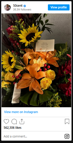 Taking to Instagram, the ‘In Da Club’ hitmaker shared an image of sunflowers amongst a bright assortment or flowers with a personalised card attached.