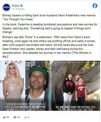 “With news from Kevin’s book breaking, once again he and others are profiting off her and sadly it comes after child support has ended with Kevin,” the statement reads, per People. “All she cares about are her kids, Sean Preston and Jayden James and their well-being during this sensationalism. She detailed her journey in her memoir [‘The Woman in Me’].”