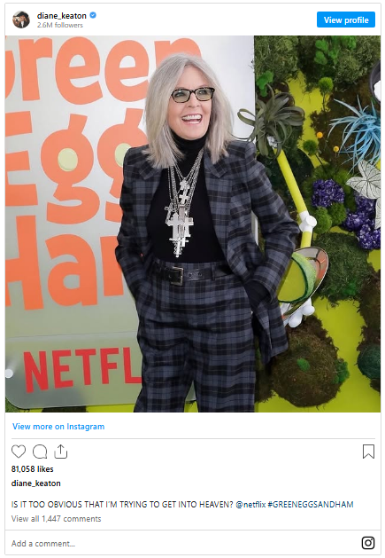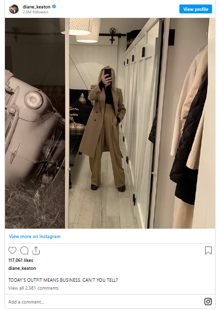 While most celebrities flaunt glitzy gowns or barely-there outfits, Keaton sports a tailored suit or a fitted shirt with high-waisted pants. She’s also not afraid to wear a turtleneck.