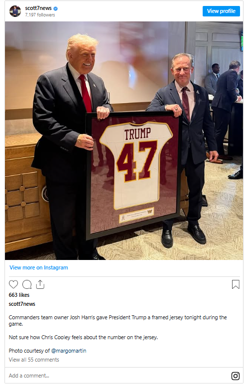 The bond between Trump and the Commanders appears stronger than ever. During the game, Trump received a framed Commanders jersey with his name and the number 47 from team owner Josh Harris.