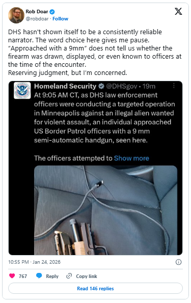 On X, he wrote: “I believe it’s highly likely the first shot was a negligent discharge from the agent in the grey jacket after he removed the Sig P320 from Pretti’s holster while exiting the scene.”