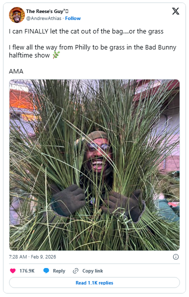 One of those leafy performers, Andrew Athias, better known on X as “The Reese’s Guy”, has now spilled the details of this very unique Super Bowl gig.