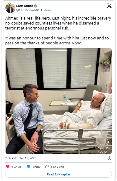 New South Wales Premier Chris Minns visited Ahmed in the hospital and wrote on X: “Ahmed is a real-life hero. Last night, his incredible bravery no doubt saved countless lives when he disarmed a terrorist at enormous personal risk. It was an honour to spend time with him just now and to pass on the thanks of people across NSW. There is no doubt that more lives would have been lost if not for Ahmed’s selfless courage.”