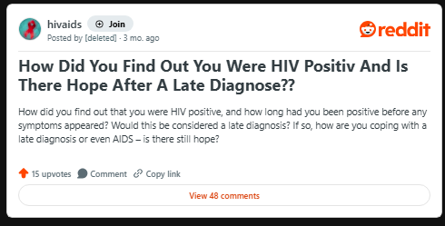 Somebody penned: “How did you find out that you were HIV positive, and how long had you been positive before any symptoms appeared? Would this be considered a late diagnosis? If so, how are you coping with a late diagnosis or even AIDS – is there still hope?”