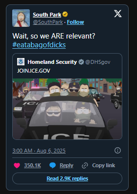 But in an apparent U-turn from the administration, Homeland Security used an image of a South Park scene to encourage people to join US Immigration and Customs Enforcement (ICE).