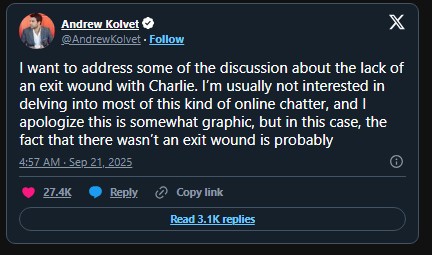 “I want to address some of the discussion about the lack of an exit wound with Charlie. I’m usually not interested in delving into most of this kind of online chatter, and I apologise this is somewhat graphic, but in this case, the fact that there wasn’t an exit wound is probably another miracle, and I want people to know,” he wrote.
