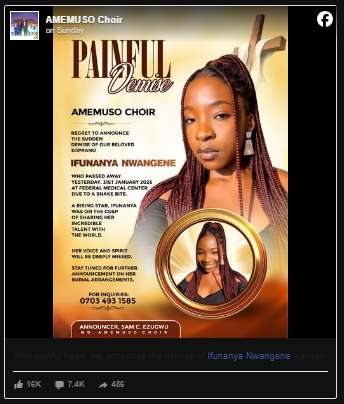 In a statement shared on Facebook, choir announcer Sam Ezugwu wrote: “With painful heart, we announce the demise of Ifunanya Nwangene Nanyah.”