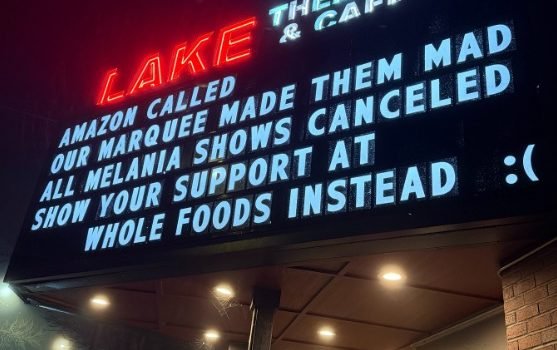 “Amazon called. Our marquee made them mad. All ‘Melania’ showings cancelled. Show your support at Whole Foods instead. Join Amazon Prime for Free Two-Day Shipping.”