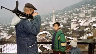 A sniper taking aim in Sarajevo (MICHAEL EVSTAFIEV/AFP via Getty Images)