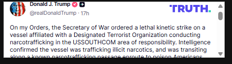 “On my Orders, the Secretary of War ordered a lethal kinetic strike on a vessel affiliated with a Designated Terrorist Organization conducting narcotrafficking in the USSOUTHCOM area of responsibility,” read Trump’s social media statement.