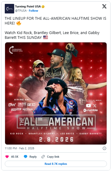 On TPUSA-related posts, one commenter described the event as “republicans with their Temu halftime show,” while another added, “I’ll be watching but I am a little disappointed in this lineup. Going to struggle getting Gen Z to care.”