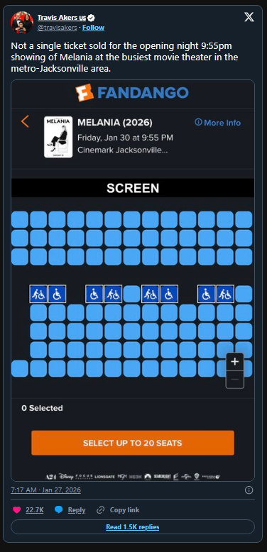 Although, whether her Amazon MGM Studios documentary film is the top of anybody’s list of things to see at the movie theater remains to be seen, with one X user revealing the rows of empty seats on display when they went to have a look at tickets sold at one theater for the First Lady of the United States’ upcoming release, titled – you guessed it – MELANIA.