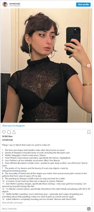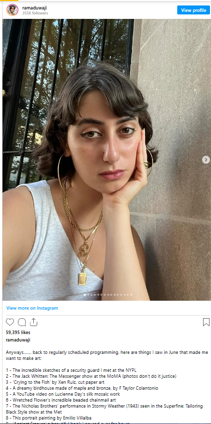 On Instagram, where she has more than 250,000 followers, her artwork often focuses on Middle Eastern women, Gaza, and the Palestinian cause.
